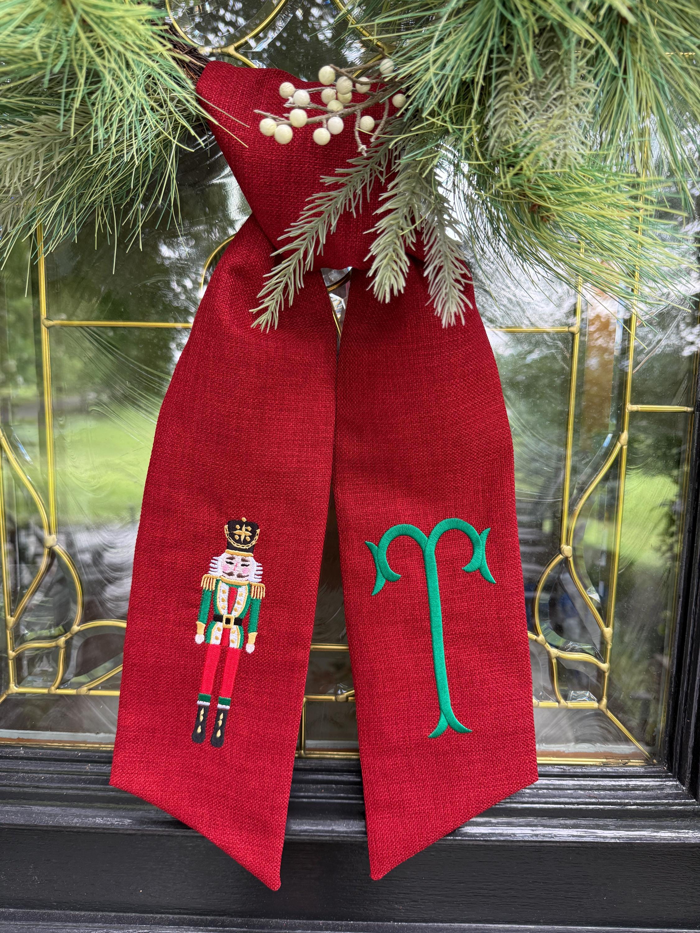 The sash comes customized to your needs with an Extra Large Red & Christmas Green Nutcracker, and your choice of monogram, one on each tail.